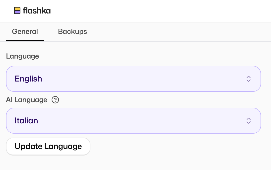 Global AI language: choose the language you want Professor Ka to speak inside AI helps and explanations
